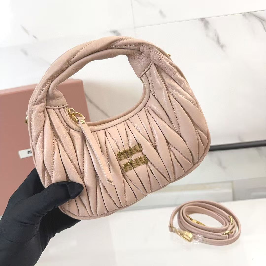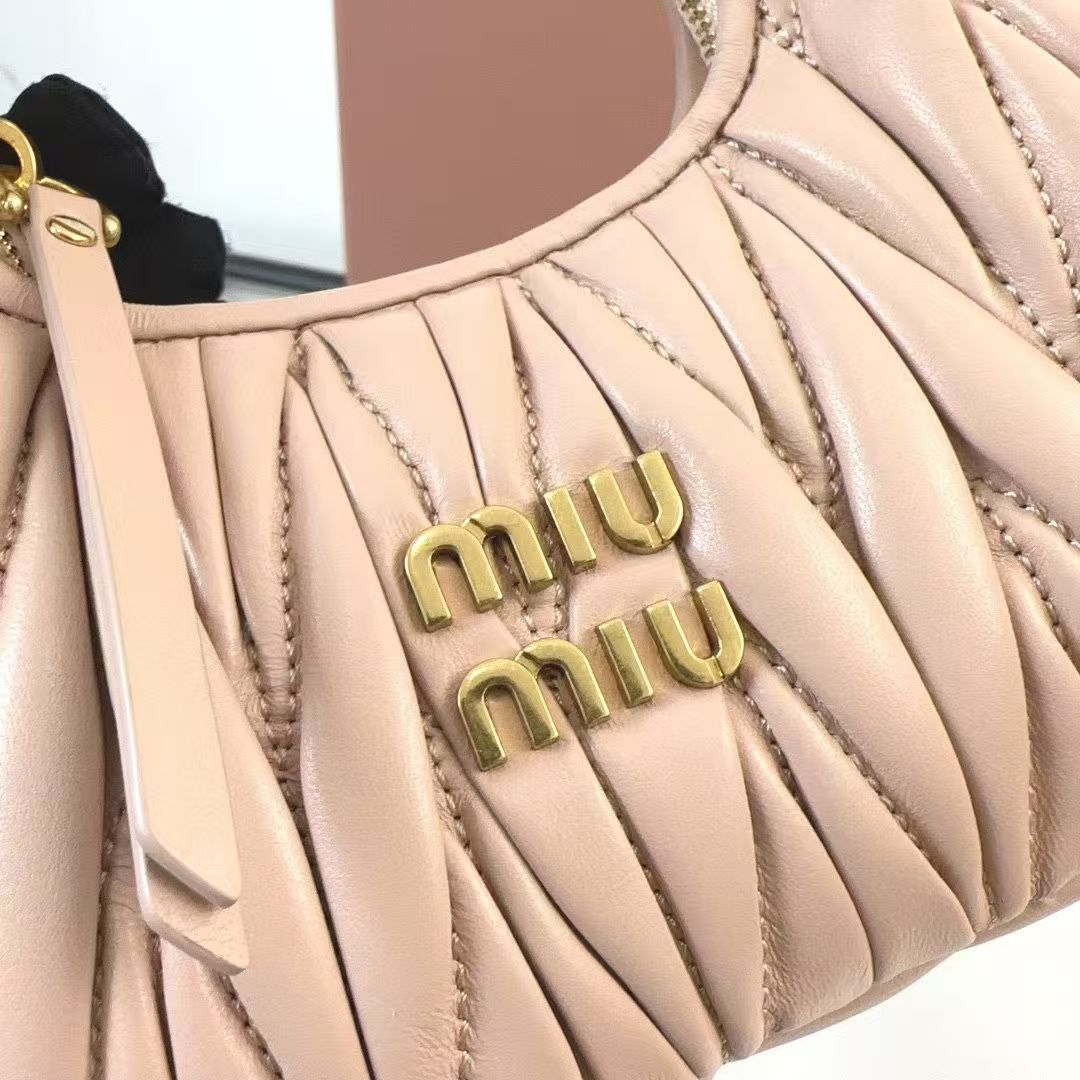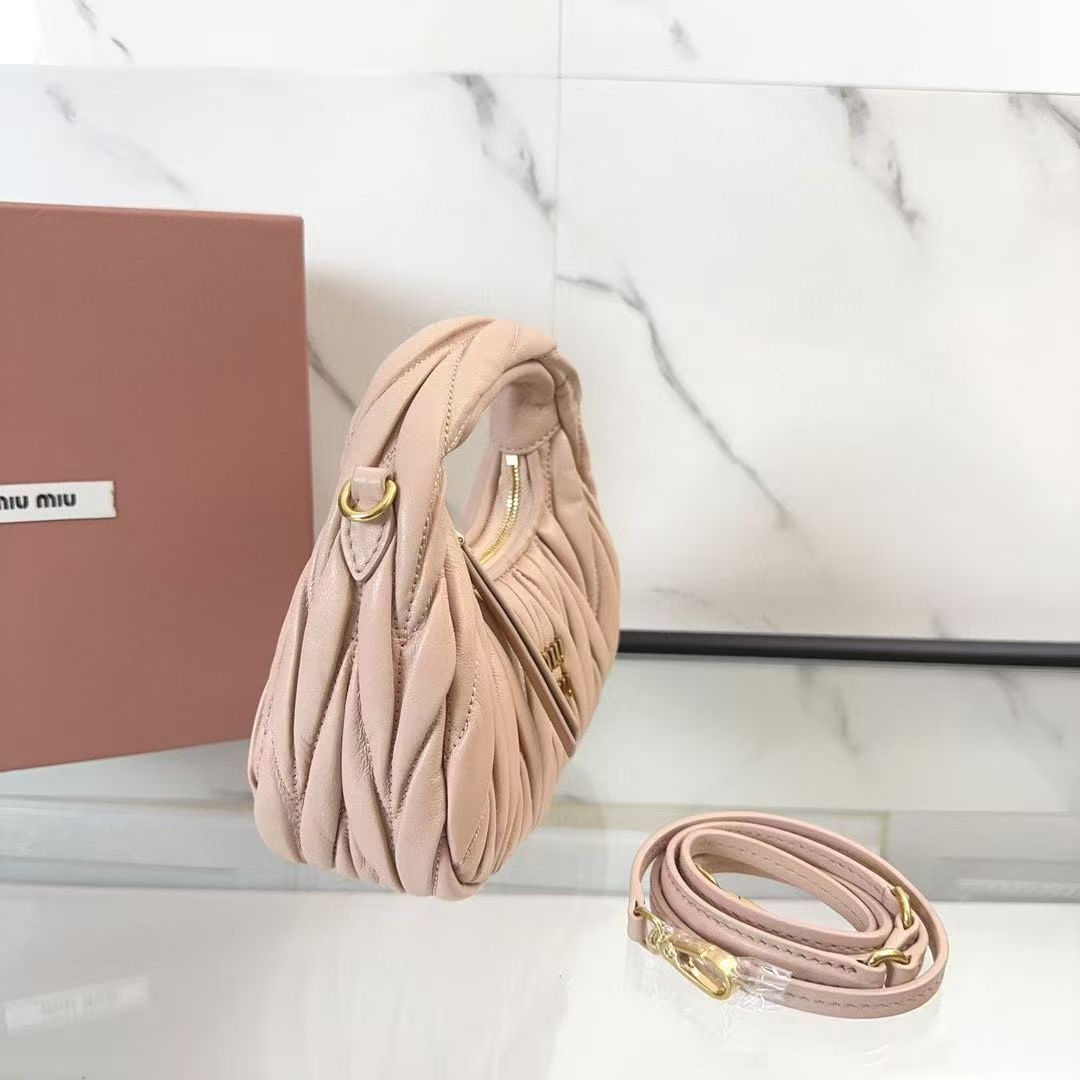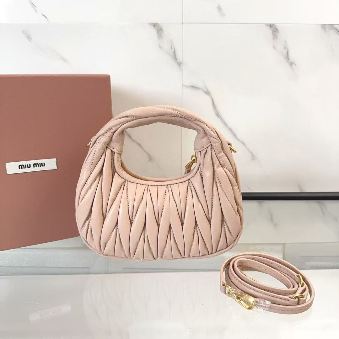 🍒 M Collection 🍒 5BP078: The new mini MiuWander handbag is crafted from premium imported lambskin, featuring the iconic brand-signature Matelassé quilted embroidery. It boasts retro matte hardware and a sleek curved silhouette that retains a playful vibe. The bag’s structured shape exudes bold personality, striking the perfect balance between sweet and edgy, with surprisingly roomy capacity. A must-have staple among top fashion influencers.