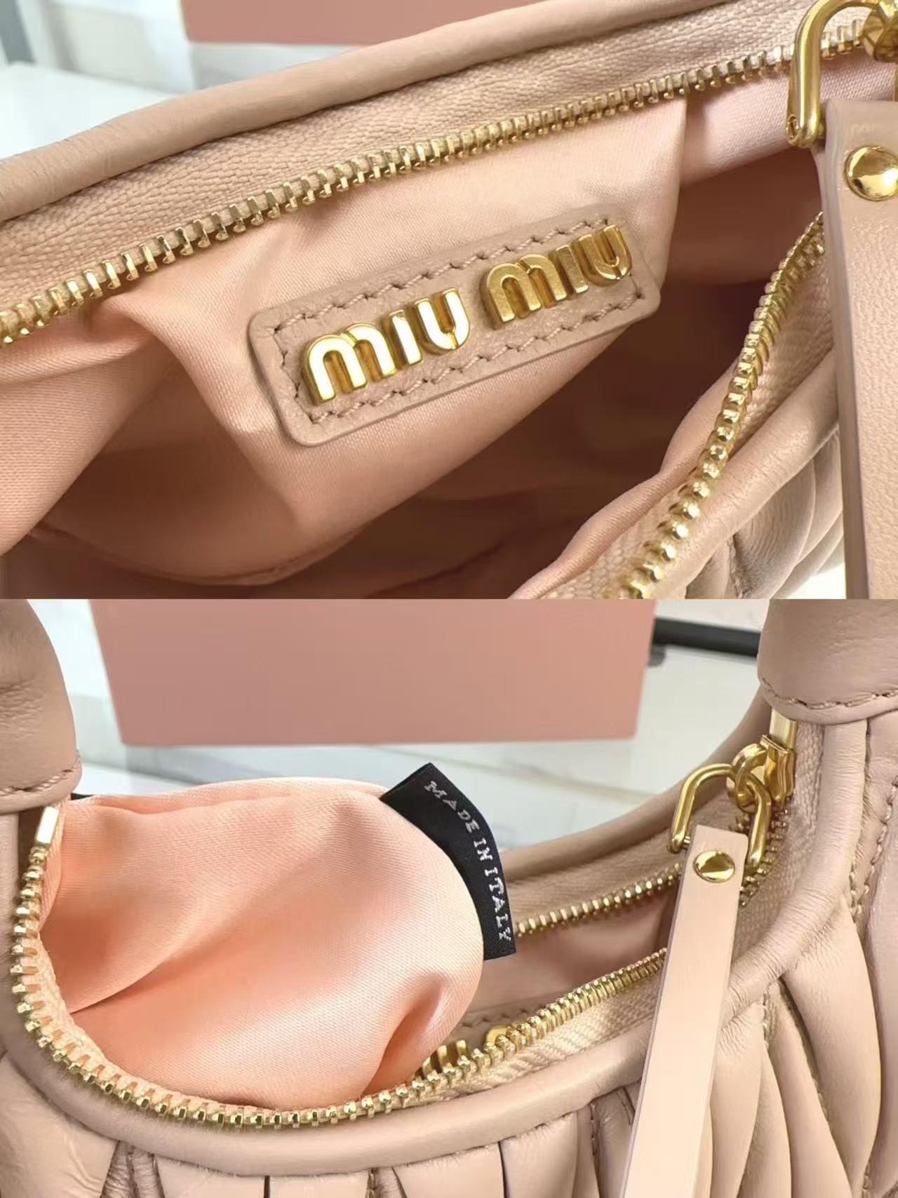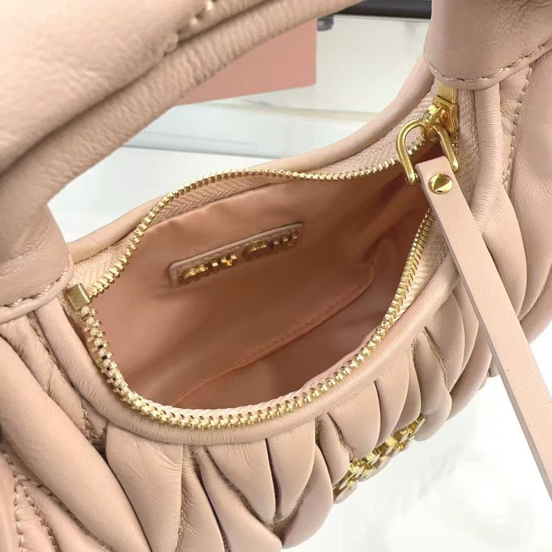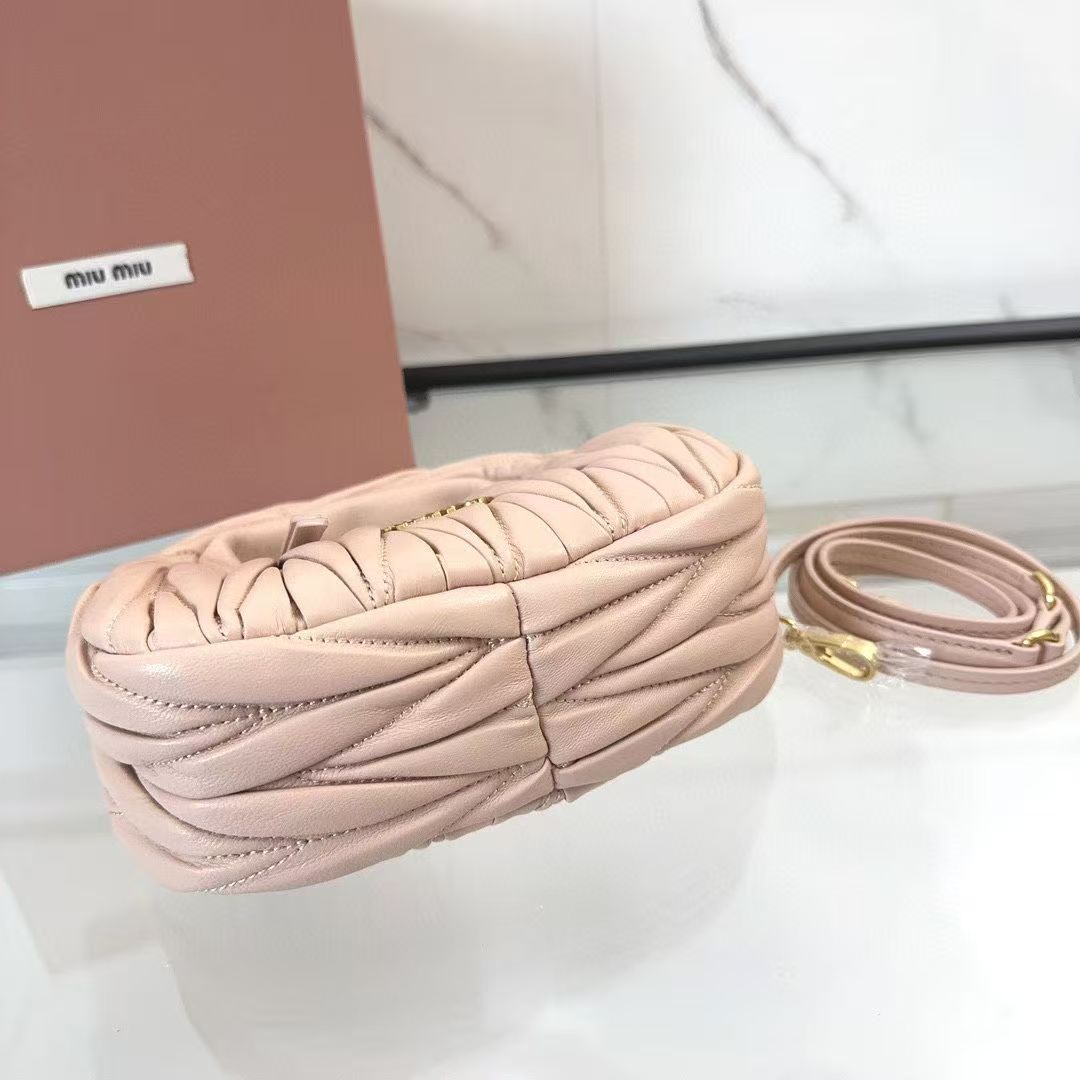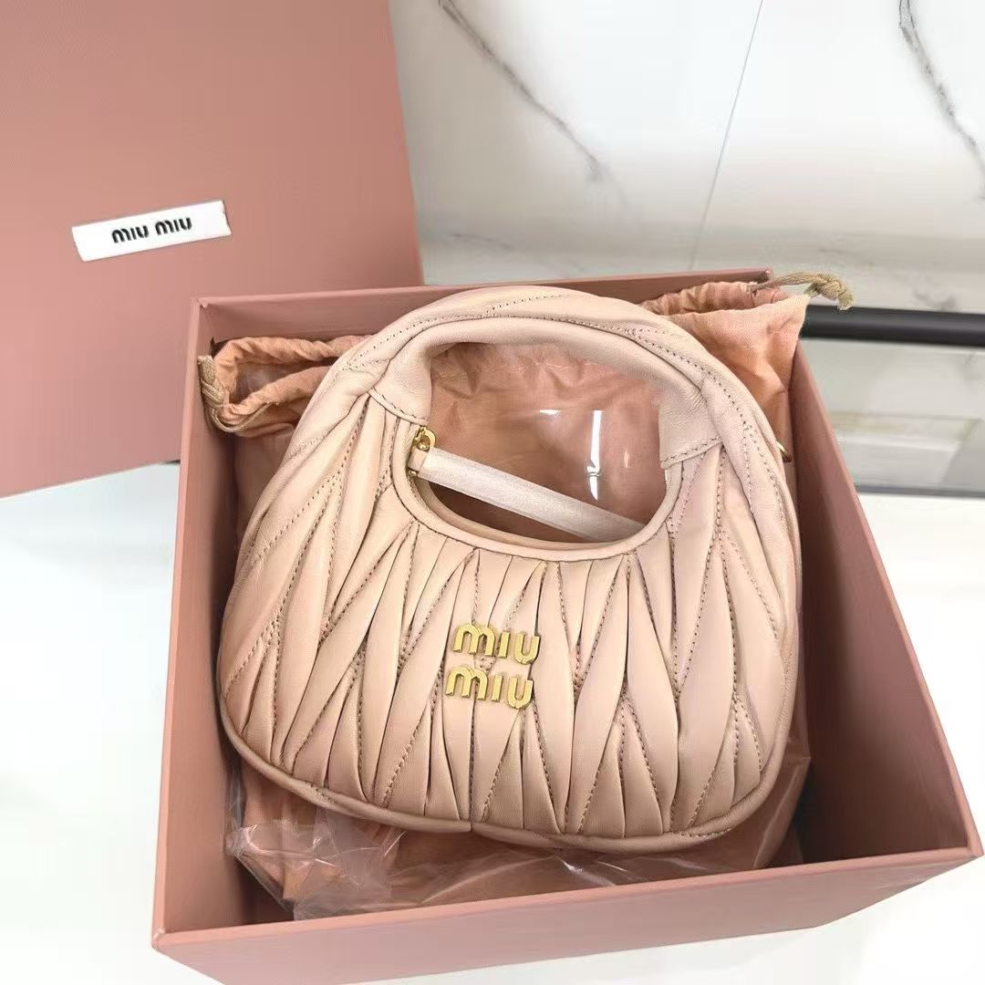 🍒 M Collection 🍒 5BP078: The new mini MiuWander handbag is crafted from premium imported lambskin, featuring the iconic brand-signature Matelassé quilted embroidery. It boasts retro matte hardware and a sleek curved silhouette that retains a playful vibe. The bag’s structured shape exudes bold personality, striking the perfect balance between sweet and edgy, with surprisingly roomy capacity. A must-have staple among top fashion influencers.